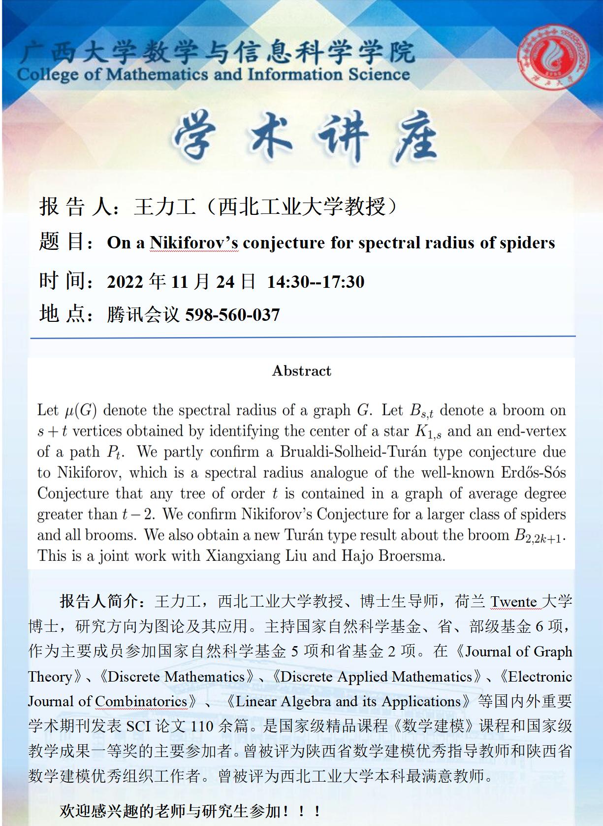 学术讲座: On a Nikiforov's conjecture for spectral radius of spiders