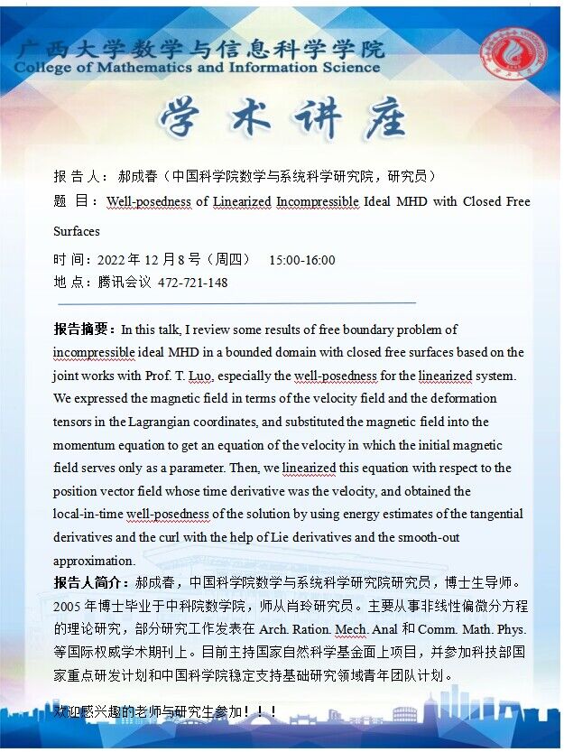 学术讲座:Well-posedness of Linearized Incompressible Ideal MHD with Closed Free Surfaces