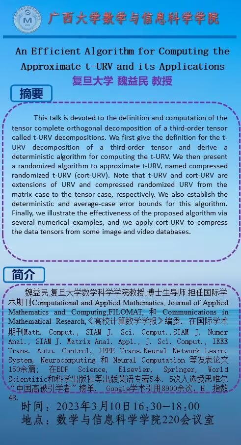 学术讲座:An Efficient Algorithm for Computing the Approximate t-URV and its Applications