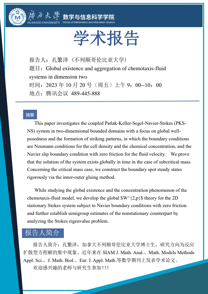 学术报告: Global existence and aggregation of chemotaxis-fluid systems in dimension two
