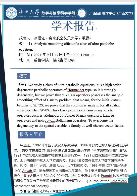 学术报告:Analytic smoothing effect of a class of ultra-parabolic equations