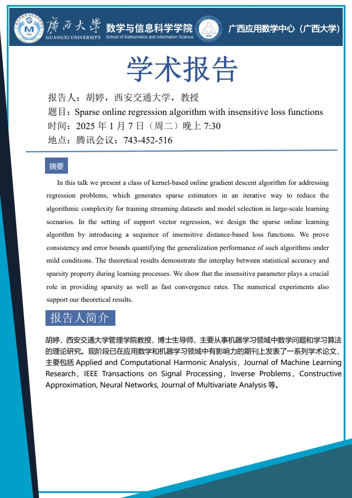 学术报告::Sparse online regression algorithm with insensitive loss functions