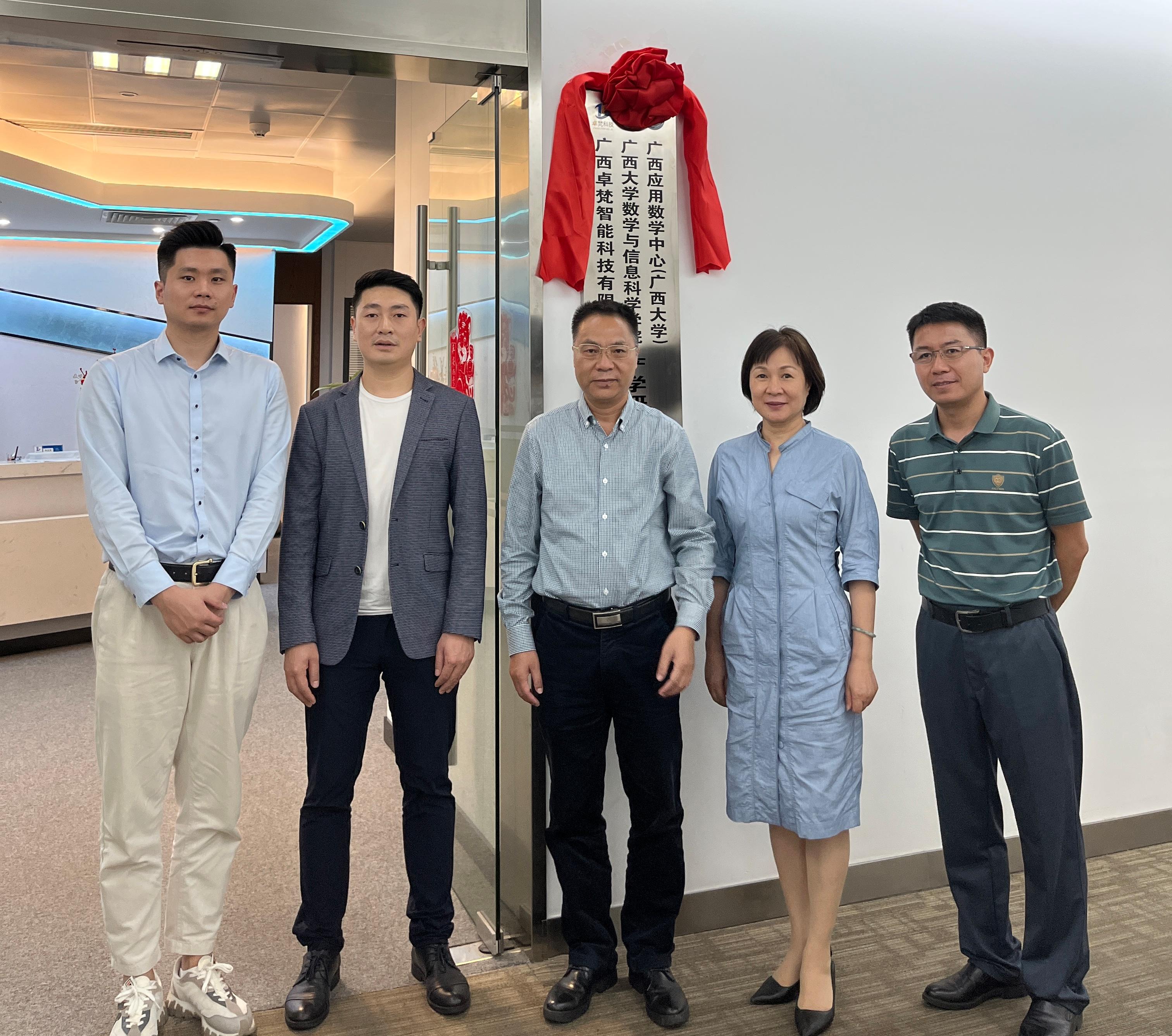 )执行主任袁功林分别代表学院和中心签约,黄建荣书记参加揭牌仪式。广西卓梵智能科技有限公司总经理舒建兵、商务部经理张晨凯、办公室主任张成瑞等公司领导员工参加仪式,广西咕咕狗科技有限公司产品发展中心知识产权总经理杜智广出席仪式。
