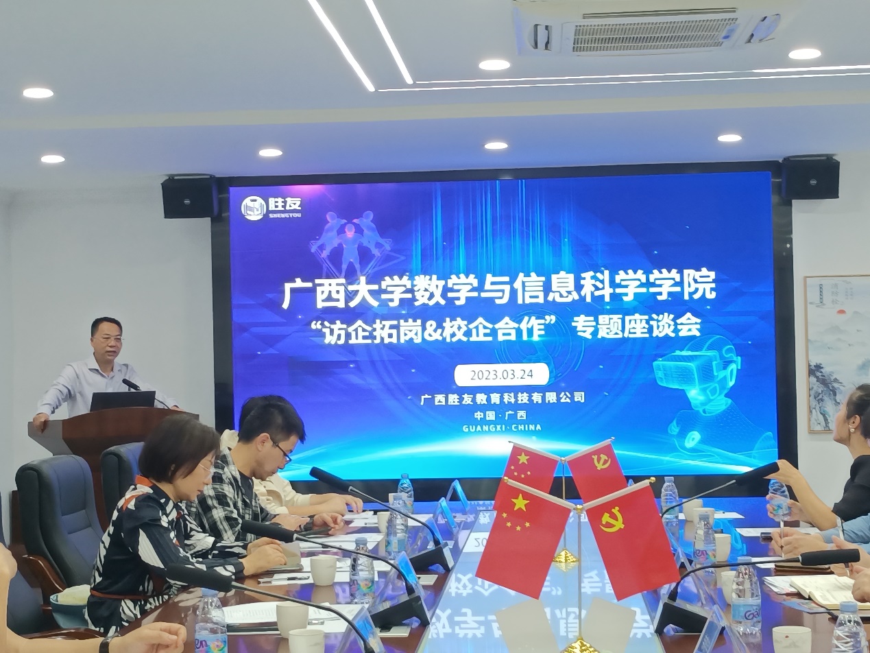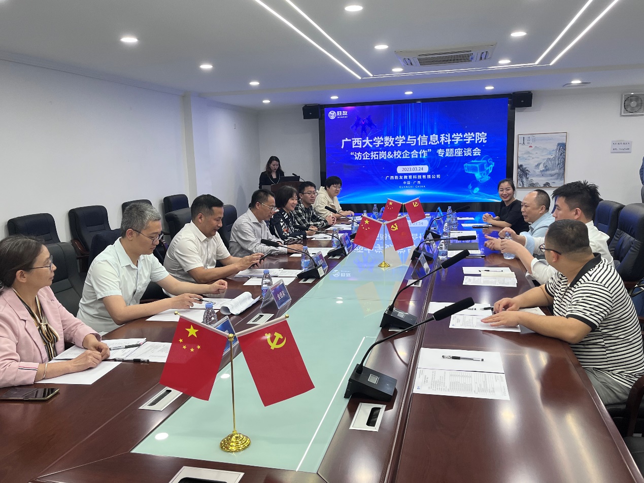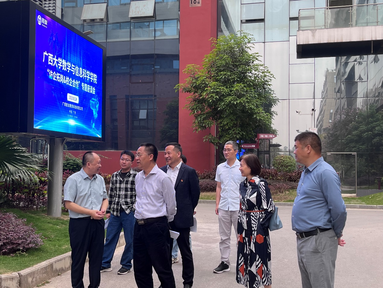 2023年3月24日下午,数信学院党委书记黄建荣、院长郭真华、党委副书记郭海燕、副院长袁功林、系主任金德泉、教师张幸与辅导员刘春霞一行前往广西胜友教育科技有限公司(以下简称“胜友教育”)开展“访企拓岗&校企合作”专项行动,受到胜友教育董事长罗起清、总经理罗剑、副总经理罗丽婕的热忱接待。企业方首先陪同参观了胜友教育发展概况,随后院企进行座谈交流。广西广电网络耀象教育科技公司总经理韦晓宇应邀出席座谈。