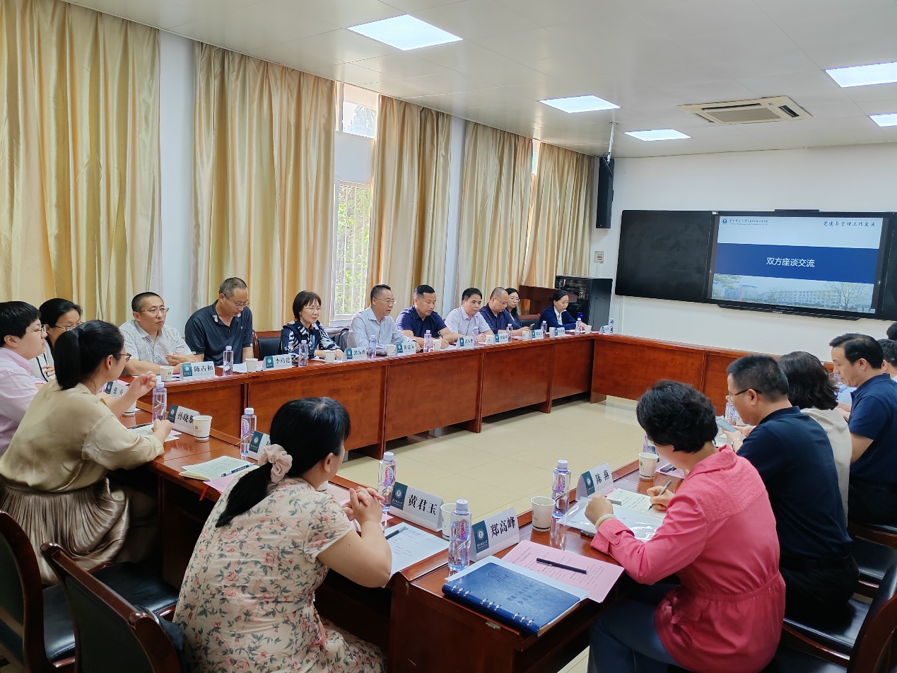 为响应中共中央《关于在全党大兴调查研究的工作方案》的号召,全面贯彻落实学校党委关于开展学习贯彻习近平新时代中国特色社会主义思想主题教育的工作要求,针对数信学院目前在党建与学生工作、智慧教育系统使用与多媒体教学中出现的问题,4月21日-23日,数信学院党委书记黄建荣、院长郭真华率领学院部分教师代表赴华中师范大学数学与统计学学院调研交流。华中师大数学与统计学学院党委书记刘成竹,党委副书记张军、田俊,副院长郑高峰等热情接待了调研组一行。