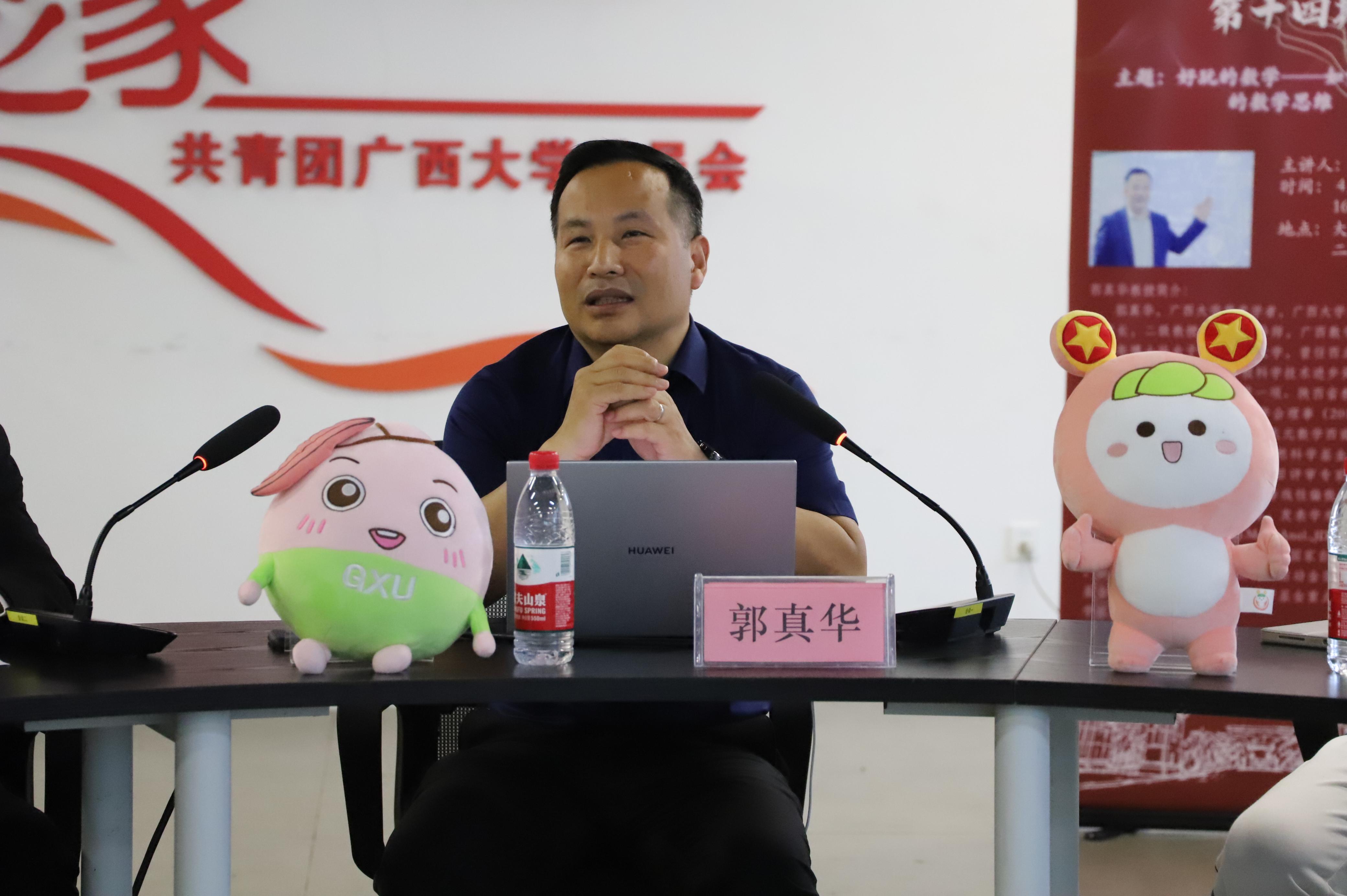 会上,郭真华教授与来自各个学院的青年学生围桌而坐,分享了自己在教学科研历程中的感想感悟。他认为,在国家日益重视基础学科的今天,教学不只是一份职业,更蕴含着深刻的社会意义,除了教授课堂知识,更要引导学生成长,塑造学生品格、品行、品味,做大先生。数学学科的教学更要具备定力和热爱,教师们应当潜心钻研、笔耕不辍,立志推动国家基础学科建设发展。郭真华教授告诉同学们,学习数学的意义不在于学具体的技巧,而在于善于用数学的思维来思考。“方程发生代数,代数指导方程”,郭教授生动例举“鸡兔同笼”、“解方程”、求根公式、微分方程等数学案例,启发大家用多维而理性的数学思维思考实际问题,感受数学的魅力。