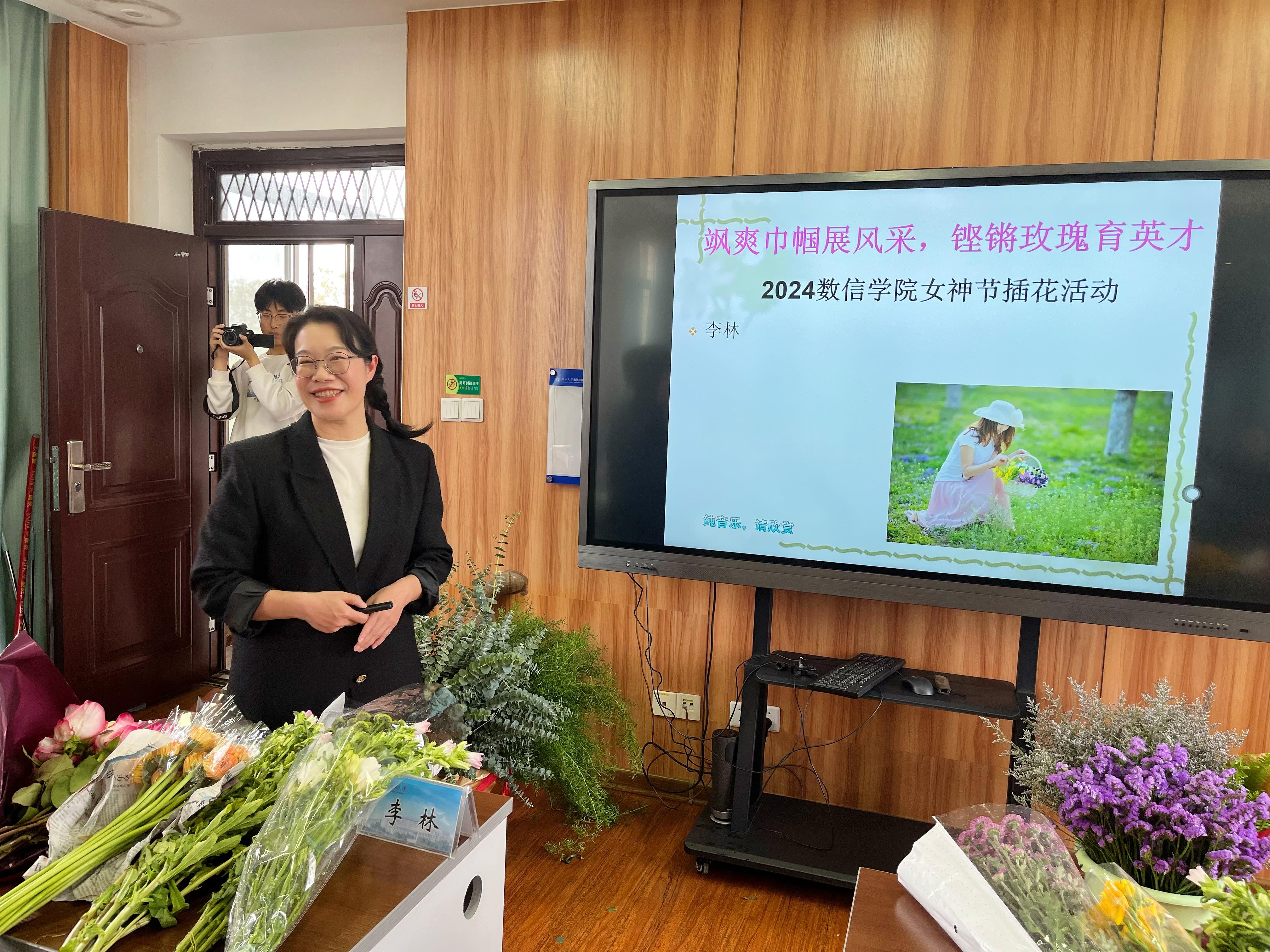 在学院501室举行“飒爽巾帼展风采 铿锵玫瑰育英才”——2024年数信学院女神节插花活动。活动特邀广西艺术学院李林教授授课并进行现场插花实操指导,学院党委副书记唐旭彬主持活动。