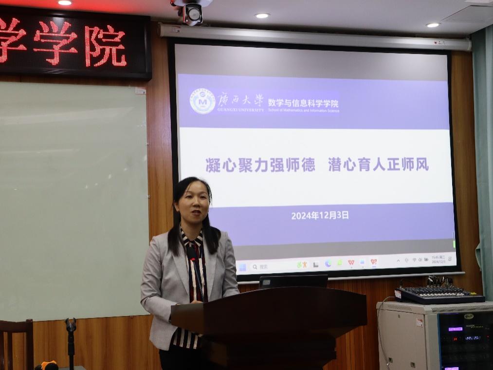 教师师德失范行为处理办法(试行)》,要求全院教职工务必知红线、守底线、筑牢意识形态思想防线,对照规定和要求勤自查、常自律。最后,她对学院正在开展的“清廉数信”建设工作提出了“认同当下、认同过去、认同他人、认同自己”的“四个认同”要求,要求全院教职工务必提高站位、拓宽视野、加强协同,秉持“凝心、传承、开放、自信”的数信人优良传统,积极参与“清廉西大”和“清廉数信”建设,共同打造风清气正的干事创业环境,携手共创数信学院美好明天。
