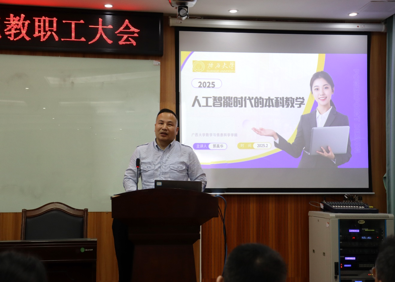 院长郭真华在会上作了题为“人工智能时代的本科教学”专题报告,动员全院教职工要主动适应人工智能时代新形势、新要求,正确认识和应对人工智能给传统教学工作带来的冲击和挑战,积极转变教学理念和教育方式,不断实现自我提升,努力成为适应人工智能时代需要的教师;充分利用AI技术,推动个性化、数据驱动的教育模式,引导学生创新学习方式方法、为未来做足充分准备;抓住人工智能新机遇,在积极参与有组织的教育教学研究中做好新思考、展现新作为。他还对高质量推进学院2025年各项工作,高质量完成博士学位点合格评估、第六轮学科评估和广西一流学科评估三项重点工作提出明确要求。