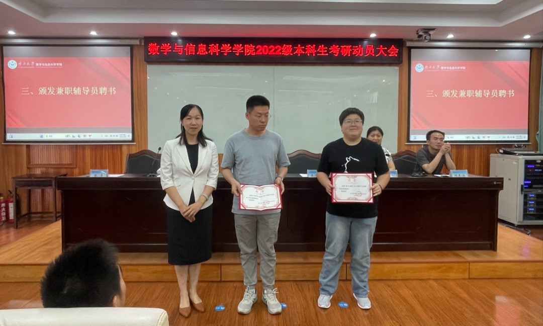 吴华丽为兼职辅导员张幸和邵景峰颁发聘书。两位兼职辅导员由学院党委选聘,将为考研备考学生提供专业的辅导与支持,帮助大家更好地应对考研挑战。