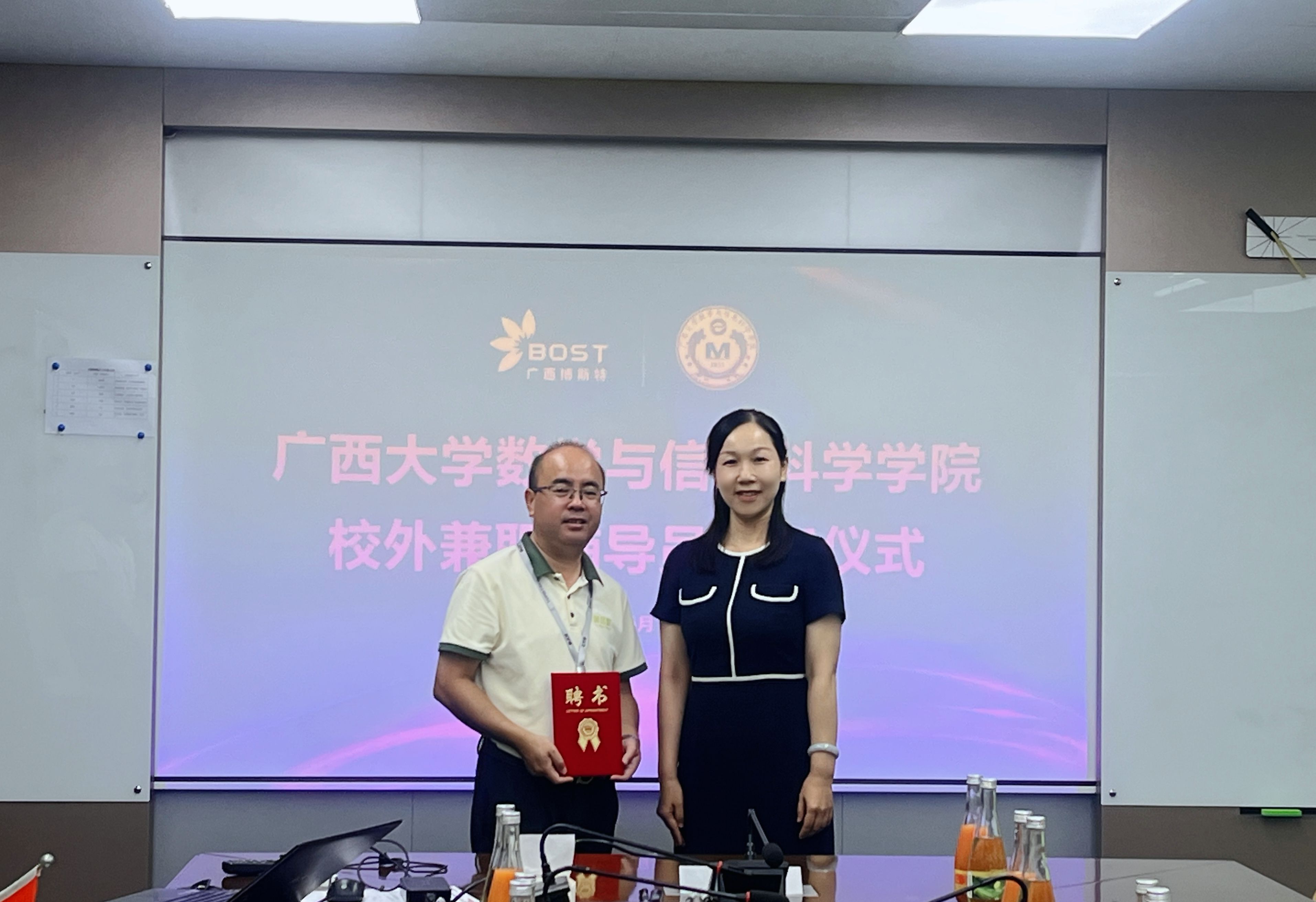 校外兼职辅导员聘任仪式,吴华丽为张誉颁发聘书,聘任其为麻豆影视