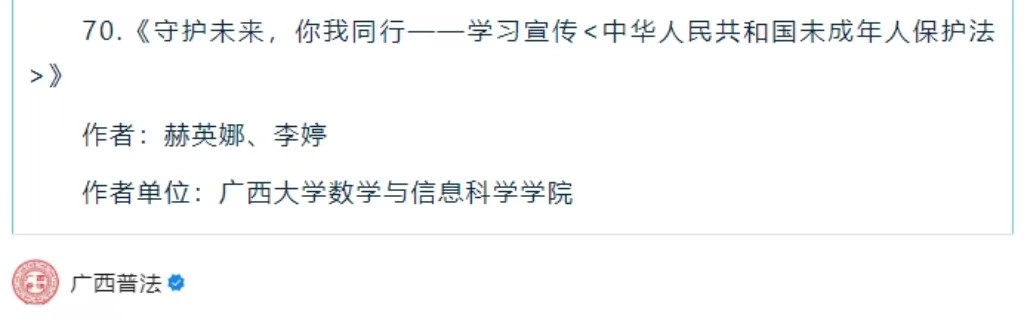 选送的微视频作品《守护未来,你我同行——学习宣传<中华人民共和国未成年人保护法>》入选优秀法治作品。