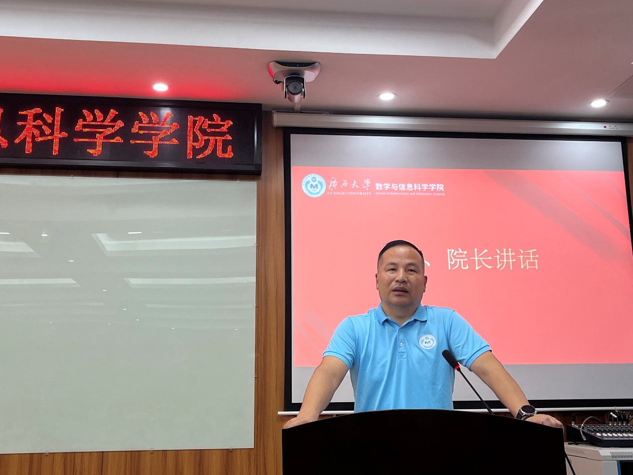 郭真华代表学院向今年入学的126名本科新同学、68名硕士研究生和16名博士研究生新同学表示热烈欢迎和祝贺。他指出,数学教育不仅仅是知识传授,更是逻辑思维和科学研究能力的培养。他强调,大学不是独木桥,比拼的不应该只有绩点的内卷,要全面发展,要注重培养大人格,研究大学问,涵养大胸怀,积蓄大能量。最后,他对新生们提出了三点要求:一是要读懂什么是大学。大学期间要不断地发现、探索自我,在打牢基础的同时留意寻找自己的兴趣和优势所在,学会思考,学会选择。二是要尊重老师,敬畏学术。要学会感恩老师的传道授业解惑,对待学术,应该时刻保持敬畏之心,恪守学术道德。三是坚持锻炼,强健体魄。良好的身体素质是做好学问的前提。拥有强健的体魄可以让同学们有足够的精力和耐力去应对长时间的学习和思考,提高学习效率,增强抗压能力。