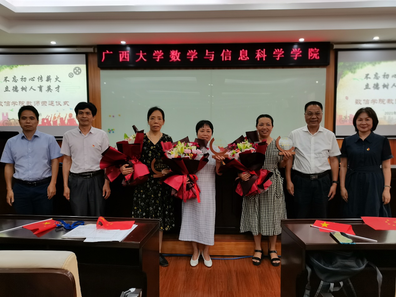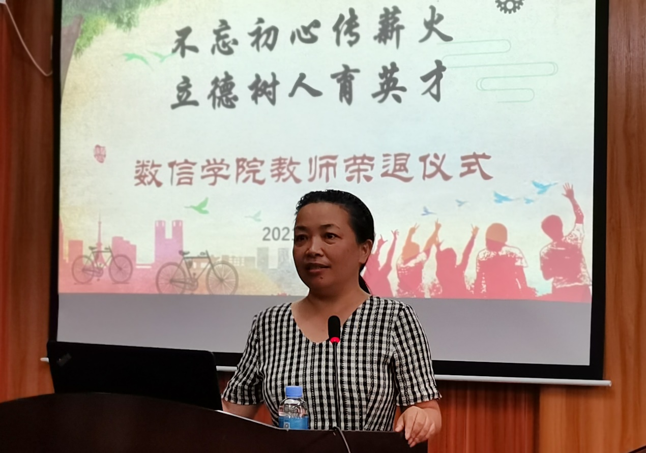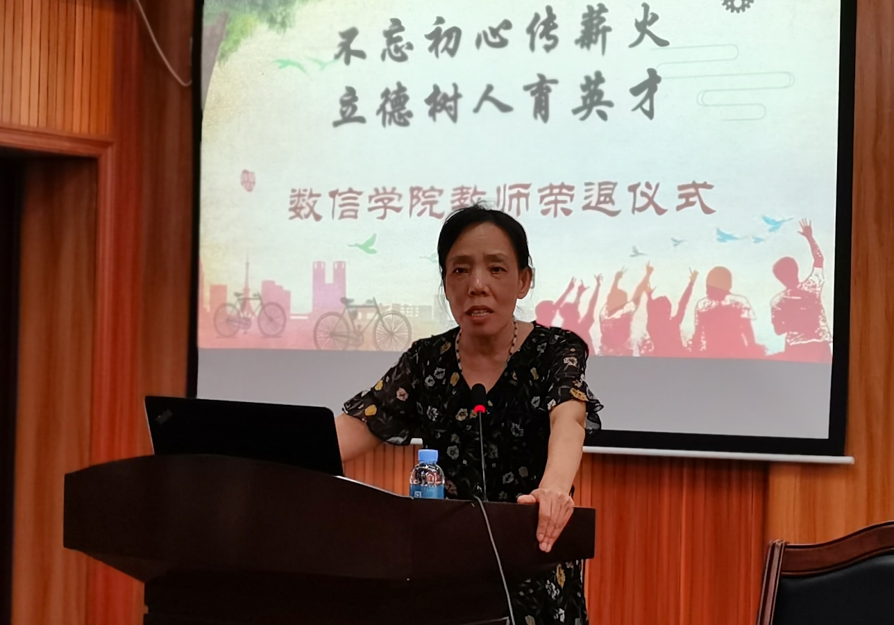 峥嵘岁月话感恩,砥砺前行献余热。学院党委书记黄建荣为荣退教师颁发纪念品、敬献鲜花并作了讲话。他指出,三位教师对从教经历的回顾,体现出了她们对教师这个岗位的深刻认知和深入解读,令人深受教育。她们字里行间的感恩之情和对学院及师生的祝福,也折射出身为一名教师“德高为师,身正为范”的良好修养。同时,学院在人才培养、学科建设和社会服务等方面的每一次变化,每一步发展,都离不开每一位老师汗水和智慧的付出。黄建荣书记强调,大爱无疆,是数信老师最美的本质;艰苦奋斗,是数信老师最纯的本色;求真务实,是数信老师最难得的本真。这些都已融进了数信精神的内涵之中,激励着每一位数信人砥砺前行。最后,黄建荣书记希望三位退休教师能科学、健康地安排好退休后的生活,拥有美好的荣退时光;希望她们能够“退休不退志,离岗不离心”,继续关心和支持学院的工作,为立德树人发挥余热;数信学院是她们永远的家,也希望她们退休以后能够常回家看看。